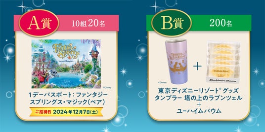 「1デーパスポート:ファンタジースプリングス・マジック(ペア)」や、東京ディズニーリゾート(R)グッズとユーハイムのお菓子が総計220名様に当たる!