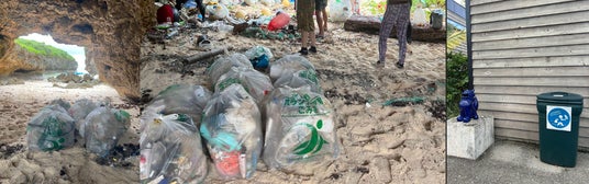 ビーチクリーンの様子とホテル内のゴミ箱