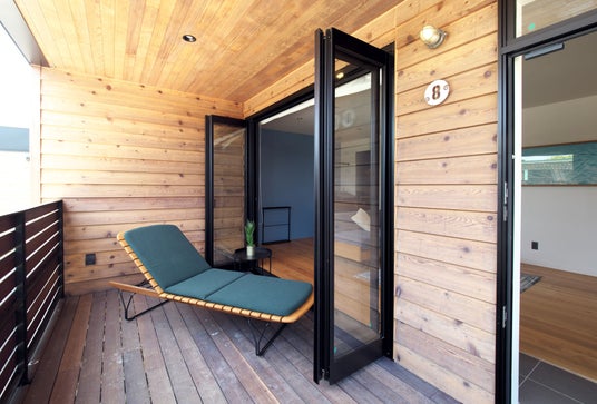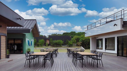 また、施設としてもサステナブルに運営できるよう、環境に配慮した建設を行いました。具体的には、鉄骨造(S造)を採用し建設時の単位面積あたりのCO2排出量の削減をしたほか、貯水した雨水を花壇等へ再利用するシステムを導入しています。ほかにも、一部店舗では塗装足場板のリサイクルフローリングや高床式による通気性の良い建設を採用するなど、なるべくコンクリートを利用せず木材も傷みにくいよう工夫しています。最大の特徴は、10ヶ月という短い期間でロスを極力出さないよう建築したことで、余った杉材は施設内の家具などとして活用しました。