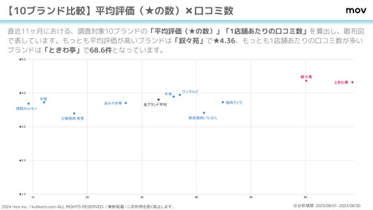 こちらの散布図では、直近11ヶ月における、調査対象10ブランドの「平均評価(★の数)」「1店舗あたりの口コミ数」を算出しています。もっとも平均評価が高いブランドは「叙々苑」で★4.36、もっとも1店舗あたりの口コミ数が多いブランドは「ときわ亭」で68.6件となっています。