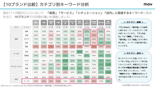 こちらの表では、直近11ヶ月間の口コミにおいて、「接客」「サービス」「シチュエーション」「店内」に関連するキーワードに焦点を当て、それぞれのキーワードがポジティブな文脈で使用される割合(ポジティブ率)の違いを調査しています。