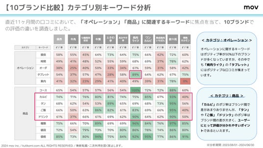 こちらの表では、直近11ヶ月間の口コミにおいて、「オペレーション」「商品」に関連するキーワードに焦点を当て、ポジティブ率の違いを調査しています。