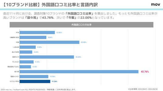 こちらのグラフでは、直近11ヶ月における、調査対象10ブランドの「外国語口コミ比率」を算出しています。もっとも外国語口コミ比率が高いブランドは「叙々苑」で43.76%、次いで「牛繁」の22.00%となっています。