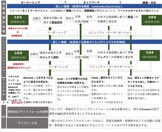 例えば、「地域で脱炭素を進める生産者」がインフルエンサーとなって、コミュニティの規範・価値に即した商品やサービスを設計し、発信し、これが地域の共有価値(Community Shared Value(CSV))の核となって、商品とともに価値が伝播・拡散され、流通・販売段階で多くの人が共感し、共感が振幅し、フォロワーとしての消費者が商品購入という形で価値を享受し充足感を得るといった、ナッジ要素を組み込んだコミュニケーションモデルが考えられます。