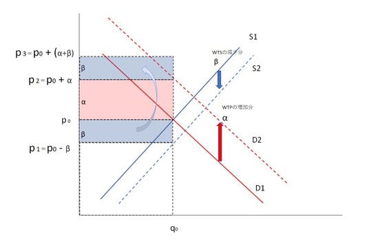 つまり、販売者にとっては現金収入以上の「うれしさ」といった価値が取引を通じてもたらされていると考えられ、上のグラフでは、βが「うれしさ」をお金に換算した値で、qと掛け合わせたブルーの面積が追加余剰です。それは販売価格(WTA)の引き下げにつながる可能性があります。