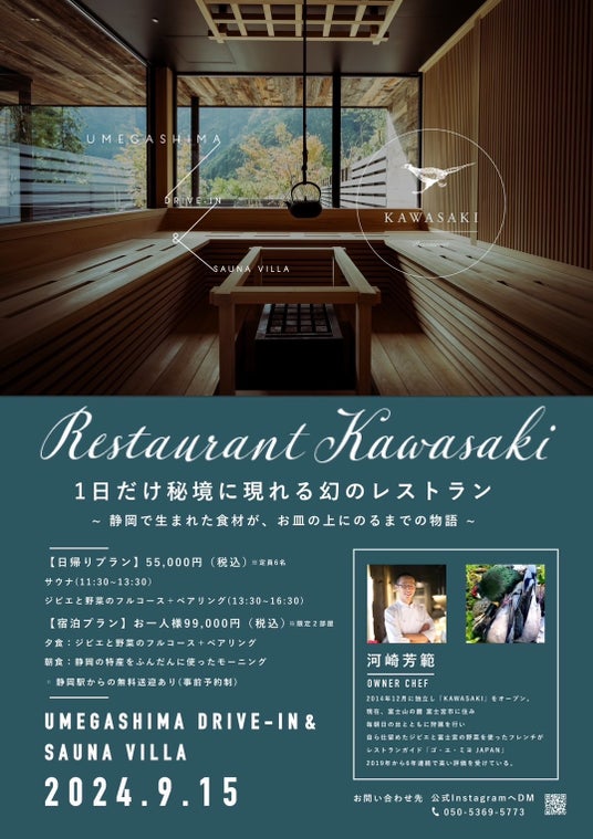 今回はその梅ケ島ドライブイン&サウナヴィラ初のサウナ+美食のイベントを企画いたしました。初めてに相応しい特別な企画「幻のレストラン」を、特別な場所で、特別なシェフ= 河崎芳範シェフをお迎えし、素敵な時間と至極なサウナ飯をお届けいたします。