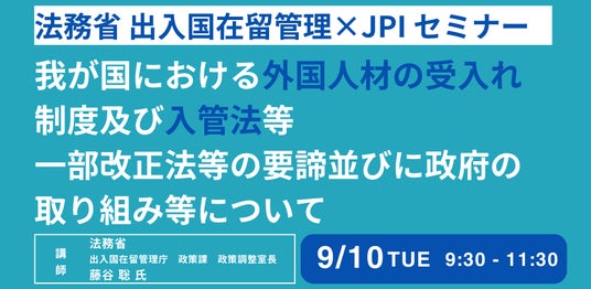 JPI(日本計画研究所)は、法務省 出入国在留管理庁 政策課 政策調整室長 藤谷 聡 氏を招聘し、外国人受入れの現況、入管法及び技能実習法の一部改正法の概要について詳説いただくセミナーを開催します。