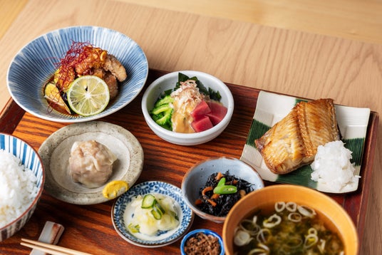 「夏の小鉢定食」のために開発した3種の小鉢の他に、定番の肉焼売・小鉢3種とご飯・味噌汁がついています。