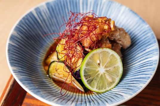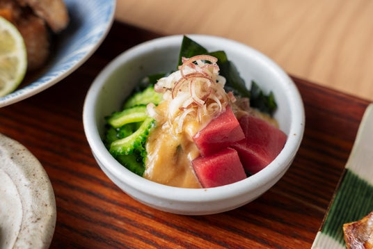 旬のシャキシャキのゴーヤを使ったぬたです。カラフルな見た目の冷菜で、涼しさを感じることができます。自家製の酢味噌をたっぷりかけ、ビールなどのおつまみにもぴったりです。