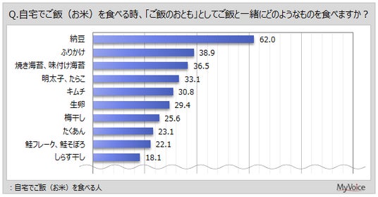 自宅でご飯を食べる人に、ご飯のおともとしてご飯と一緒に食べるものを聞きました(複数回答)。「納豆」が62.0%、「ふりかけ」「焼き海苔、味付け海苔」「明太子、たらこ」「キムチ」が各30%台となっています。