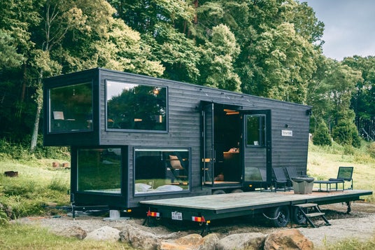 黒を基調とした都会的センスのボックス型キャビン「THE STAGE」。ウッドテラスや内外装共に国産杉材をふんだんに使っています。