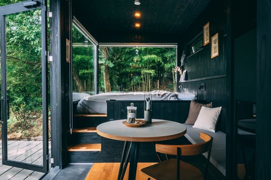 黒を基調としたスタイリッシュなボックス型のキャビン。自然の中で浮かぶ感覚の、巨大なガラス窓が2面に広がる主寝室や、大きく開くガラス扉からウッドテラスへ続く、インドア&アウトドアリビング。国産杉材をふんだんに用いたナチュラルな室内。自然の中に溶けこんでいくTHE NATURE体験を楽しめます。