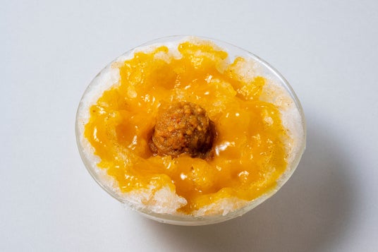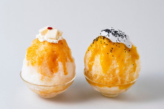 季節入替で8月15日から新登場するのが、ほうじ茶の香ばしい香りとすっきりとした味わいのシロップの上に、クリーミーな甘さと鮮やかな色が特徴的な安納芋シロップを合わせた「安納芋とほうじ茶」のかき氷。氷の中のナッツと醤油を練り込んだ芋あんには、店頭でも人気の「アコメヤの醤油」を使用し塩味をプラス。ナッツのカリっとした食感がくせになる、秋の訪れを感じるかき氷です。トップの黒ごまホイップが全体の味をまとめ上げます。
