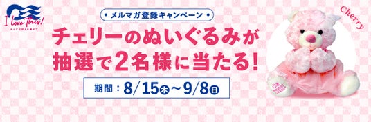 プリンセス・クルーズは、キャンペーン期間中にメールマガジン「プリンセス・メール」に新規ご登録いただいた方の中から抽選で2名様に、チェリーのぬいぐるみが当たるプレゼントキャンペーンを実施します。キャンペーンの詳細は、「チェリーのぬいぐるみ プレゼントキャンペーン」ページよりご確認ください。