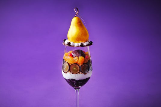 旬を迎える巨峰と洋梨をアレンジした「巨峰と洋梨のパフェ」のグラス内には、上から瑞々しい巨峰のシャーベット、その周りにキャラメルでコンポートした大人の味わいの洋梨、グロゼイユ、香り豊かな甘みとコクが魅力のナガノパープルのスライス、洋梨のカスタードクリームをギュッと詰め込みました。さらに下の層には、上層の甘みに対してアクセントとなるクリスピーな食感のホワイトチョコレートクランチ、まろやかな酸味のヨーグルトシャンティ、爽やかで上品な巨峰のジュレを配し、異なる食感を演出。グラスのトップはパリっと軽い食感のチョコレートで蓋をし、その上にカシスのシャンティ、ゴールドカラーが華やかな洋梨のシャンティを中に忍ばせた洋梨の飴細工をのせてアーティスティックに仕上げました。食べ進めるごとに味わいと食感の変化を楽しめ、香り豊かでコクのある巨峰と様々な素材と組み合わせてアレンジした洋梨が織りなす秋らしさ満点のマリアージュをご堪能いただけます。
