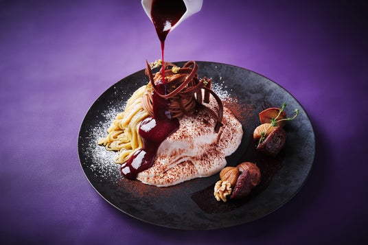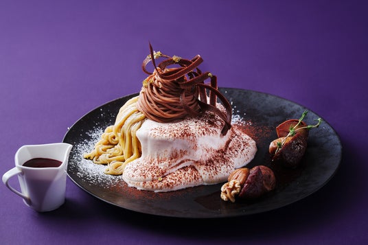 「ダブルモンブランパンケーキ」は、熊本県産の和栗とフランス産の洋栗のモンブラン2種を一度に味わえる贅沢なパンケーキに仕上げました。ふわふわとしたスフレパンケーキ生地の間には、なめらかな口当たりのカスタードクリームと甘酸っぱいミックスベリーを挟み、その上から軽やかでコクのある焼き栗フレーバーのマロンシャンティ、風味豊かで繊細な味わいの和栗のモンブランを半々ずつたっぷりとかけました。トップには香ばしく濃厚な洋栗のモンブランで包み込んだチョコレートムースとバニラアイスをのせ、さらにチョコレートのチュイールをあしらい濃厚かつ奥深い味わいを演出。また、カシスのソースをかけることでほどよい酸味がアクセントになり、最後まで飽きの来ない大人の味わいをお届け。別添えのホクホクとした食感の熊本産渋皮栗、フランス産洋栗、赤ワインでコンポートしたイチジクのコンポート、クルミをお好みで加えていただくことでより一層風味豊かにお楽しみいただけます。