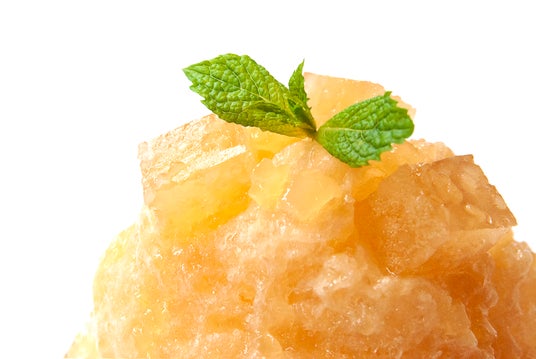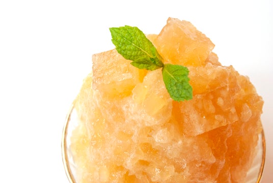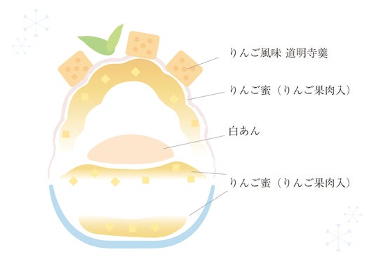 もちもち・つぶつぶ食感の「道明寺(どうみょうじ)」は、もち米由来。関西風の桜餅をはじめ上生菓子、棹物など、古くから和菓子には欠かせない素材です。この原料となる「道明寺粉」をりんごジュースにひたして、みずみずしい甘味が美味しい「りんご風味の道明寺羹」をつくりました。ころころと角切りにした「道明寺羹」は見た目も涼やか、氷のしゃりしゃり食感とのアクセントも魅力のトッピングです。