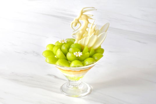 そしてローズホテル横浜のシグネチャースイーツでもあるドラゴンパフェは、9月限定で苺からシャインマスカットに姿を変えてお届けいたします。中には自家製シャインマスカットのゼリーと北海道産生クリーム、酸味とコクのレモンクリームにマスカルポーネアイスを重ね、トップにはシャインマスカットを贅沢に使いホワイトチョコレートのドラゴンを飾りました。