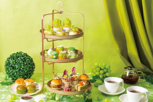 アフタヌーンティーでは、ムースリーヌでコクを出した「シャインマスカット ショートケーキ」や、みずみずしい甘さと酸味が相性の良い「シャインマスカット レモンムース」、パンナコッタの上にシャインマスカット、シャインマスカットゼリーを飾りつけた「シャインマスカット ヴェリーヌ」などをご用意。またセイボリーには、ピクルスと玉ねぎなどを合わせスパイシーに仕上げた「ミニバンズ 鮪のグリル アボカドレリッシュ」や、チャツネの酸味と甘みが燻製の香りとごぼうの風味を引き立てる「ゴボウのブランマンジェ スモークダック アップルチャツネ」など4種のセイボリーにもご注目ください。横浜元町 紅茶専門店「ラ・テイエール」のフレーバードティーをはじめとする10種以上のドリンクとあわせてお楽しみいただけます。