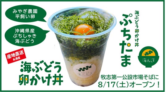 沖縄県糸満市にある日本初※1の海ぶどうのテーマパーク「海ん道~uminchi~」は、新業態となるPOP UP店舗「海ぶどう卵かけ丼 ぷちたま」を那覇市の牧志第一公設市場そばに2024年8月17日(土)にオープンすることを発表します。