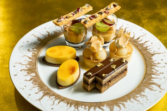 メインとなるグランドデザートは、プリンスホテル名誉総料理長 内藤武志が監修。ライブステーションにてお客さまの目の前でマロンクリームを搾り、金粉をあしらった「搾りたてモンブラン」をご提供いたします。ザクザク食感のヘーゼルナッツのメレンゲをベースに、中心に栗を丸ごと1粒、その周りをフワッと軽いさっぱり生クリームで囲い、仕上げに濃厚なフランス産の栗を使用したマロンクリームを纏わせた、食べ進めるごとに食感が楽しめる贅沢な逸品になっております。