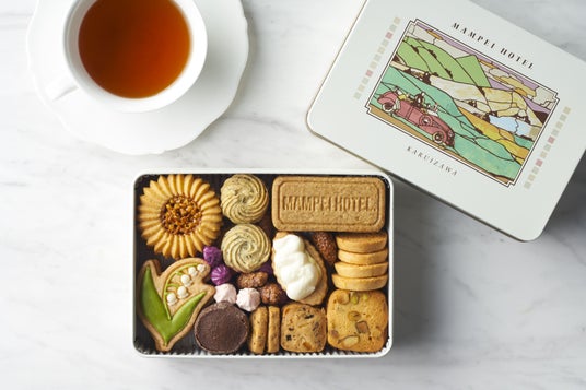 ホテル伝統のアップルパイをはじめ、当ホテルならではのオリジナルアイテムを揃える「ショップ」。ソフトオープンを記念した新アイテム「万平ホテルプレミアムクッキー缶」や、出来たての味わいをお楽しみいただける「万平ホテル ベーカリーコレクション」のほか、お土産にぴったりのパウンドケーキやスイーツ、ステーショナリーなどが並びます。