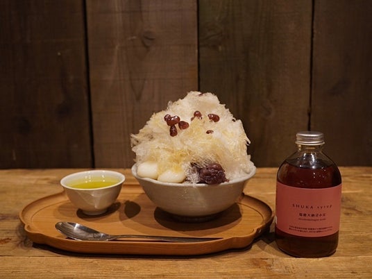 夏季限定で提供している売茶中村謹製のかき氷。「SHUKA syrup 瑞穂大納言小豆」の香りとコクは、急須で淹れた香り高い煎茶をしっかりと引き立ててくれます。