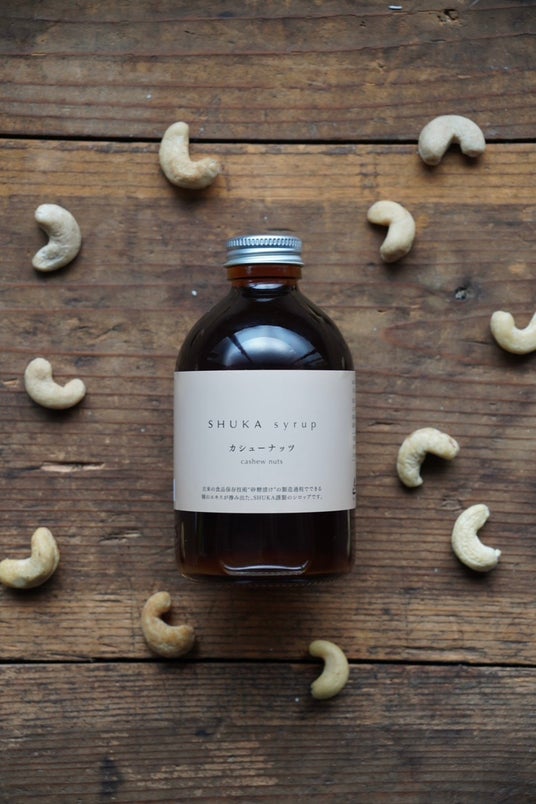 甘納豆づくりで用いられる古来の食品保存技術"砂糖漬け"の製造工程でできる、従来は廃棄されることが多かったシロップ。SHUKAでは、従来の豆類だけでなくナッツ類を新たに取り入れ、漬け込む種の種類によって合わせる砂糖の種類をセレクトしています。この度、従来の甘納豆のものとは異なる、種の個性を愉しめるサステテブルなシロップとして商品化しました。