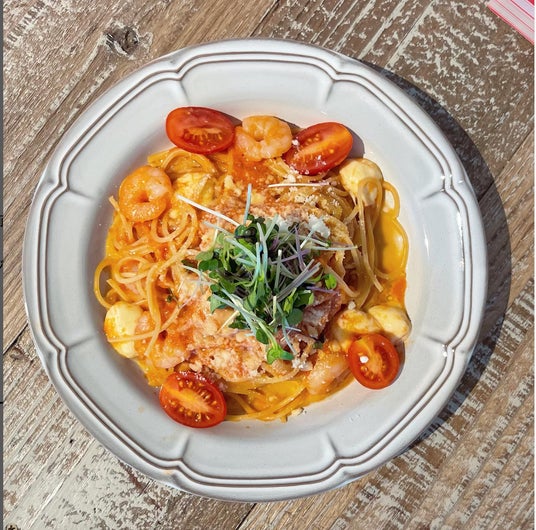 パフェグラスに盛り付けられた地場産の野菜で作るフレッシュサラダにつづき、フレンチシェフ監修のパスタやオムハヤシ、バーゼル名物のカレーなどをメインで召し上がっていただきます。