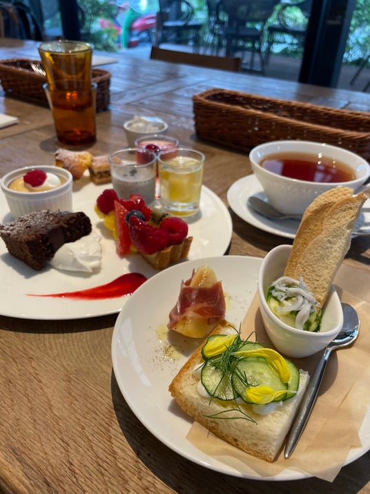 その日おすすめの季節のケーキ、ゼリー、焼き菓子7-8種類に、オープンサンド、キッシュなどのセイボリー2-3種類をお楽しみいただけます。淹れたての自家焙煎コーヒー、厳選した10種類を超える紅茶、ハーブティーがフリーフローもお楽しみいただけます。
