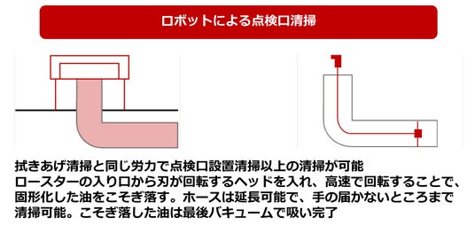 当社の油汚れ清掃に関するノウハウと、地方独立行政法人東京都立産業技術研究センターの自動化・ロボット開発の知見とを組み合わせ、飲食店の課題を解決するため、人間の手では清掃が困難なダクト管清掃ロボットの共同開発を進めておりました。