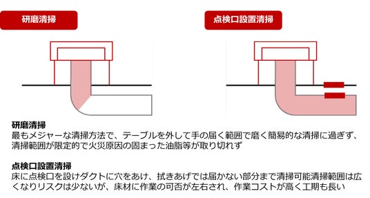 近年、全体の火災件数は減少傾向にありますが、飲食店の火災件数は増加傾向にあり、特に焼肉店ではその傾向が顕著で、中でも無煙ロースターに起因した火災が増加しております。その主な要因は、火のついた肉片や炎が排気ダクト管に吸い込まれ、ダクト内にこびりついた油脂などに着火し出火するものです。排気ダクトは床下や壁内を通っており、構造的に清掃できない場合が多く、できる場合も床板や壁材をはがして清掃を行う必要があり、時間も金額も多くかかります。