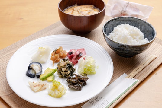 店内では約15種類のお漬物、ご飯、味噌汁、焼きおにぎりをご用意。そのままはもちろん、お茶漬けにするのもオススメです!