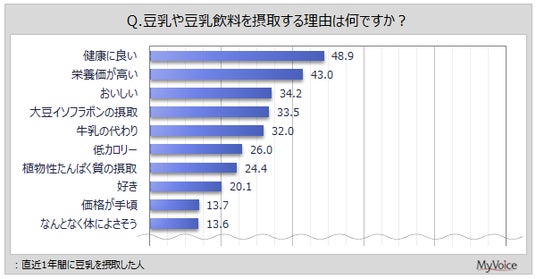 直近1年間に豆乳を摂取した人の摂取理由は(複数回答)、「健康に良い」が48.9%、「栄養価が高い」が43.0%、「おいしい」「大豆イソフラボンの摂取」「牛乳の代わり」が各3割強です。