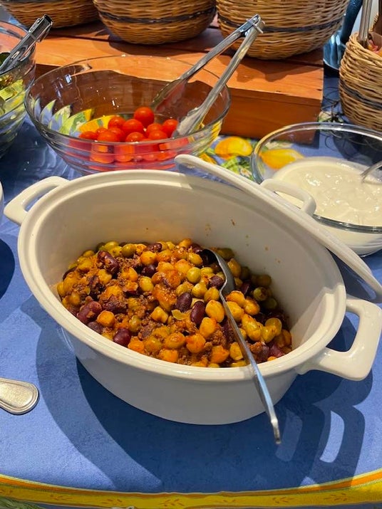 地場産野菜のサラダ、自家製キッシュ、豆料理、リオレ(フランスのライスプディング)に加え、ブレックファストには欠かせない定番の卵料理、チーズにハムやシリアルをラインナップ。