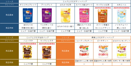 発売当初の「オリジナルブレンド」「アールグレイ」に加え、2022年8月には「はちみつ紅茶」、「ほうじ茶」、「しょうが紅茶」の3商品を、そして2023年8月には「スパイス香るチャイ」と新カテゴリーの「ミルクとけだす珈琲バッグ カフェラテ」「ミルクとけだす珈琲バッグ キャラメルラテ」を発売し、より豊富なラインナップを揃えています。