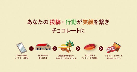 本キャンペーンは、カカオの国のことや「1チョコ for 1スマイル」の取り組みに関する“学び”のアクション(投稿・行動)が、カカオの国の未来を担う子どもたちへの支援に繋がる期間限定のキャンペーンです。この取り組みを通じて、より多くの方にカカオ生産国の課題を知っていただければと考えています。まずは知ることがカカオ産業のサステナビリティ向上への一歩となり、カカオの国の子どもたちの笑顔の“たね”になると私たちは考えこのキャンペーンを企画しました。「チョコレートを食べる人も、カカオの国で学ぶ子どもたちも、みんなの笑顔を未来につなぎたい。」それが森永製菓の想いです。