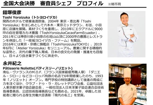 審査員には、大会アドバイザーの大森由紀子氏、永井紀之シェフ、鎧塚俊彦シェフの3氏に加え、東西予選ブロックを審査した8名のシェフも参加。当日はYouTube(スイーツ甲子園事務局)の公式アカウントからライブ配信を実施します。(配信URL:https://sweets-koushien.com/live/)
