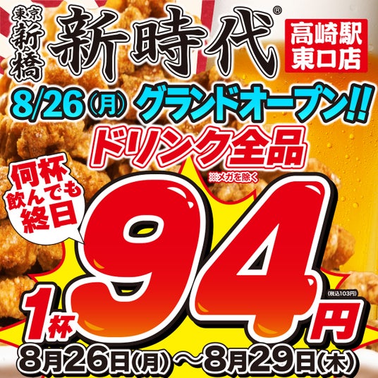 「新時代 高崎駅東口店」のオープンを記念し、メガ以外のドリンク全品94円(税込103円)キャンペーンを開催します。