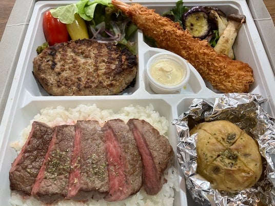 「洋食弁当」 税込4,000円~4,500円 ハンバーグに加え、サーロインステーキや、エビフライなど食べたい洋食メニューが一堂に揃った豪華弁当。会合にも使えるかも。(前日までの要予約)