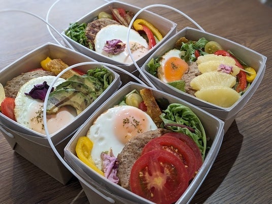 ●NEW「ハンバーグ屋のロコモコ丼」全5種 各税込1,000円~1,100円/ハンバーグと目玉焼きに、野菜たっぷりロコモコ丼は、ノーマル、トマト、パイン、アボカド、和風の全5種。電子レンジ対応の持ち手付き容器で、持ち運びも便利。