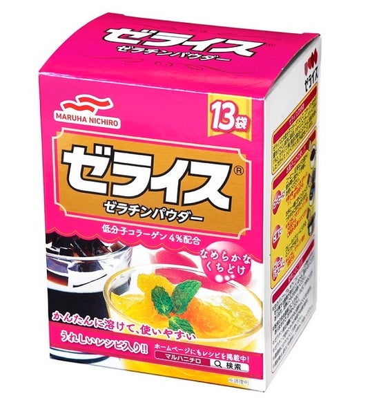 お湯の中に振り入れてかき混ぜるだけで簡単に溶ける、顆粒状のゼラチンです。「豚」由来のコラーゲンから作られています。ゼライスはゼリーを作るための製菓材料として知られていますが、実は日常のさまざまなシーンで活用でき、さらにコラーゲンの摂取にも役立ちます。
