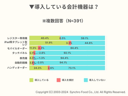 次に、導入している会計機器について尋ねたところ、最も多かったのは「iPadなどのタブレット型レジ」で、51.9%、さらに「レジスター専用機(40.4%)」、「ハンディオーダー ※従業員が専用機器を使用(24.3%)」という結果になりました。「タッチパネル ※セルフオーダー、テーブルオーダー」、「券売機」、「自動釣銭機」は、9割以上の飲食店が導入しておらず、今後の導入も検討していないことがわかりました。