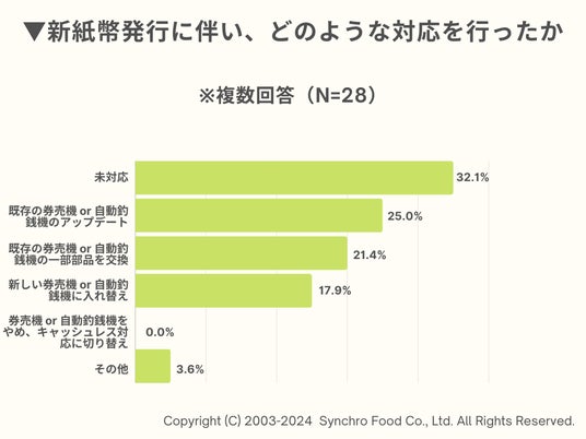 上記で「券売機」や「自動釣銭機」を導入していると回答した店舗を対象に、7月3日の新紙幣発行に伴う対応について聞いたところ、「まだ対応できていない」が32.1%を占めたものの、67.9%がソフトウェアのアップデートや部品の交換など、既に何らかの対応を実施したことがわかりました。一方で、この機会にキャッシュレス対応に切り替えた店舗は0%でした。