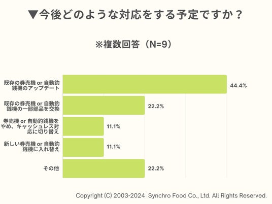 一方、「券売機」または「自動釣銭機」を導入している飲食店のうち、新紙幣発行に対して「まだ対応できていない」と回答した約3割に、今後どのような対応を行う予定か聞いたところ、最も多かったのは「ソフトのアップデートをする」で44.4%。また、「キャッシュレス対応に切り替える」との回答も11.1%みられました。