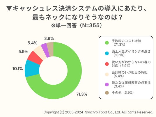 また、導入にあたり、最もネックになると思われること(またネックとなっていること)を聞いたところ、71.3%が「手数料のコスト増加」と回答。「売上入金タイミングの遅さ」と回答した店舗も1割ほどみられました。
