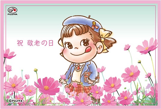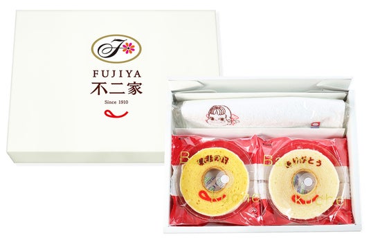長寿のお祝いとしてぴったりのバウムクーヘンに「敬老の日」&「ありがとう」のメッセージ、ペコちゃんの舌をイメージした不二家洋菓子店の「スマイルマーク」を転写しました。「バウムクーヘン」・「ミルキーバウムクーヘン」各2個ずつに、ペコちゃんの刺繍が入った今治タオルを詰め合わせた、敬老の日限定のオリジナルギフトです。こちらもペコちゃん敬老の日メッセージカード付きです。