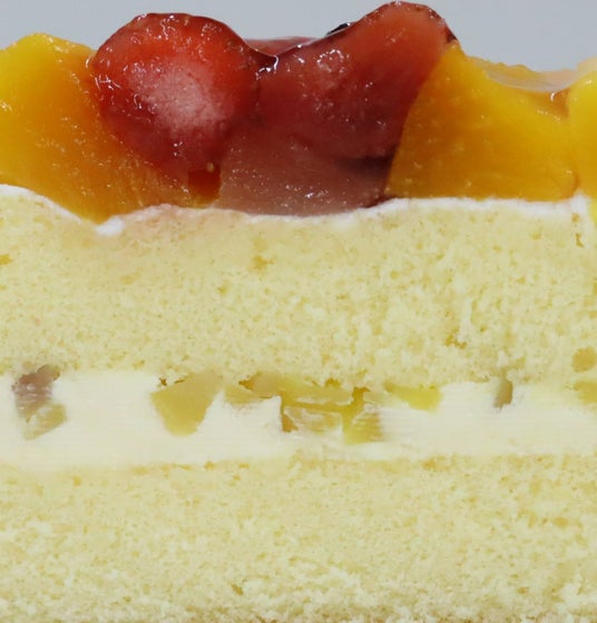栗甘露煮のダイスカットと軽いタイプのカスタードクリームをサンドし、上面にマンゴー・黄桃・洋梨やベリーなどのさまざまなフルーツのシロップ漬けを飾りました。