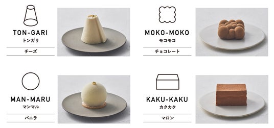 なじみのあるスイーツたちを、一見ケーキに見えない不思議な形で再現しました。想像力がかきたつように、装飾も色もシンプルな形にしています。親しみやすいよう、形から連想される名前をつけました。