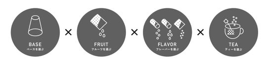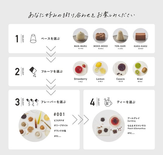 ベース×フルーツ×フレーバー×フレーバーティの4つの掛け合わせを自分でセレクトできるセットで、選ぶ時から食べ終わるまでのワクワクする体験を提供します。